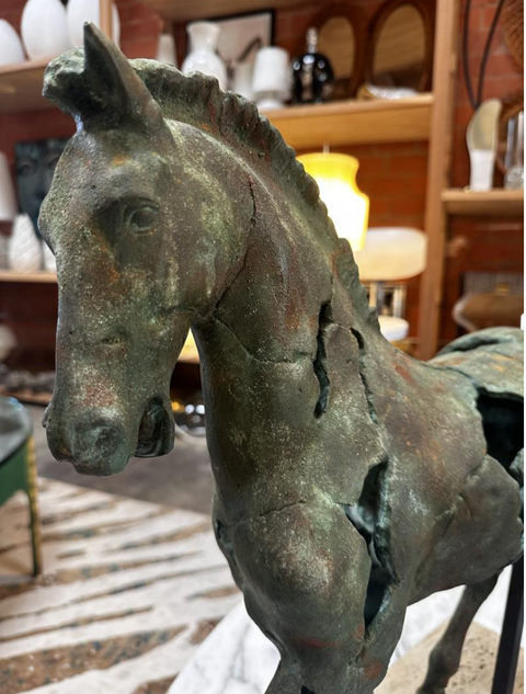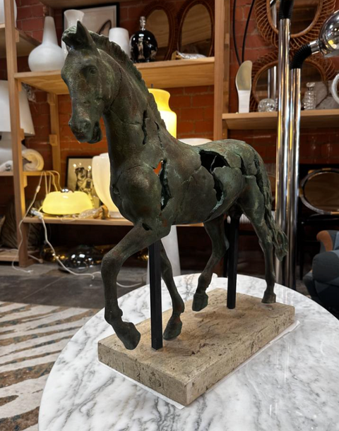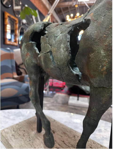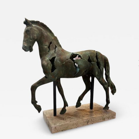 Italian sculpture from the 1980s depicting a horse in motion, executed in a fragmented and deconstructed form. Cast in patinated bronze or composite material with a weathered verdigris finish, the piece captures both classical anatomy and modern abstraction. Sections of the horse's torso are intentionally ruptured or hollowed, revealing an expressive tension between strength and decay. Raised on twin iron rods anchored to a travertine or stone base, the work recalls Arte Povera and Brutalist influences, while paying homage to ancient equine statuary.