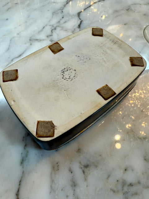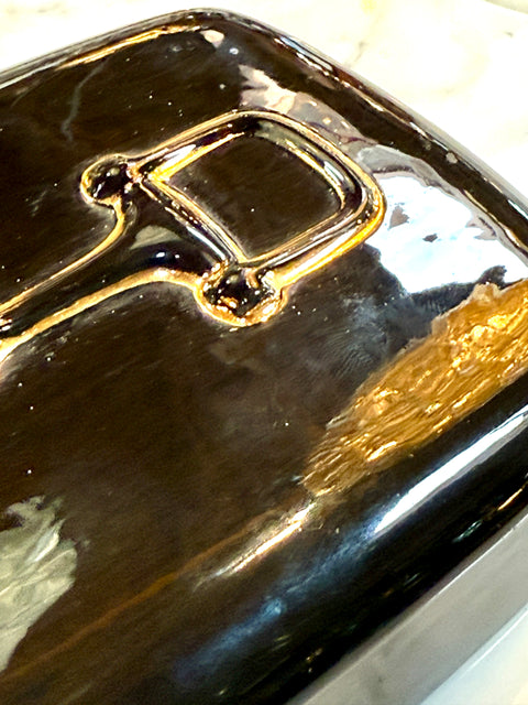 Elegant and refined, this ceramic catchall by Gucci dates to the 1980s and reflects the brand’s iconic blend of luxury and functionality. The deep green glaze is accentuated by the classic Gucci gold-tone insignia on the lid, offering a bold contrast and a touch of opulence. Perfectly proportioned for use as a jewelry box, valet tray, or desk accessory, it’s a versatile accent for any interior. The interior is finished in a high-gloss ivory glaze, enhancing its practicality and charm.