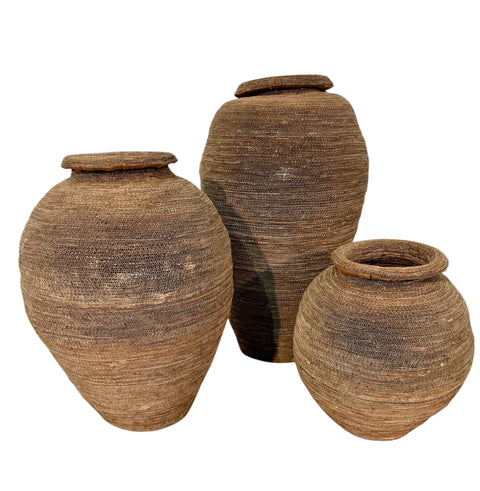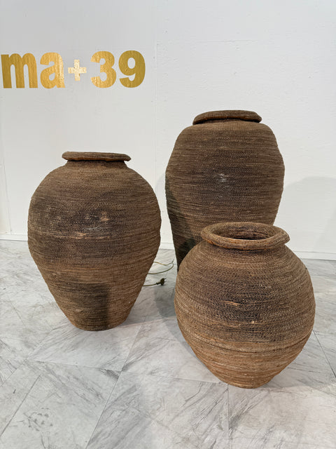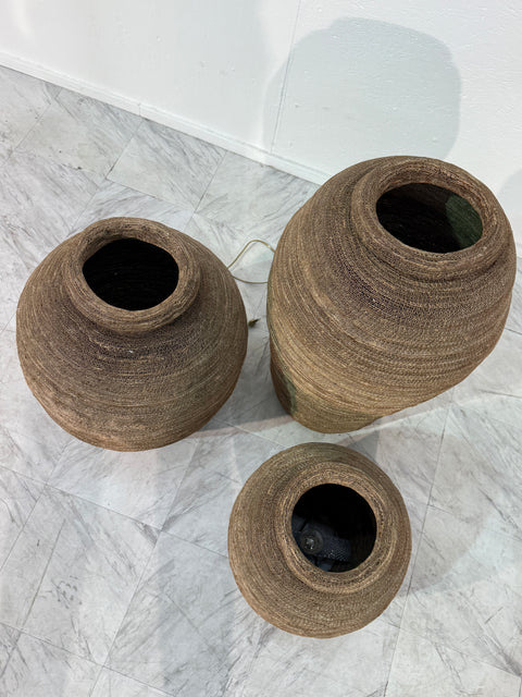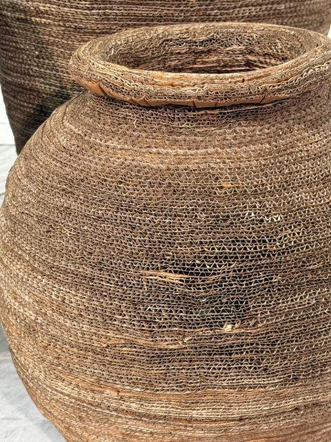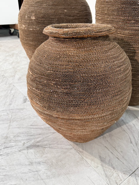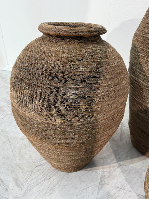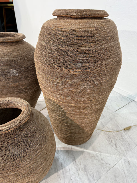 This set of three floor lamps is crafted from tightly hand-woven, coiled, and layered corrugated cardboard. Each form evokes the silhouette of an ancient amphora or woven basket, with a warm, earthy texture and sculptural depth. The natural material allows light to softly filter through the delicate gaps, creating an ambient, diffused glow.
