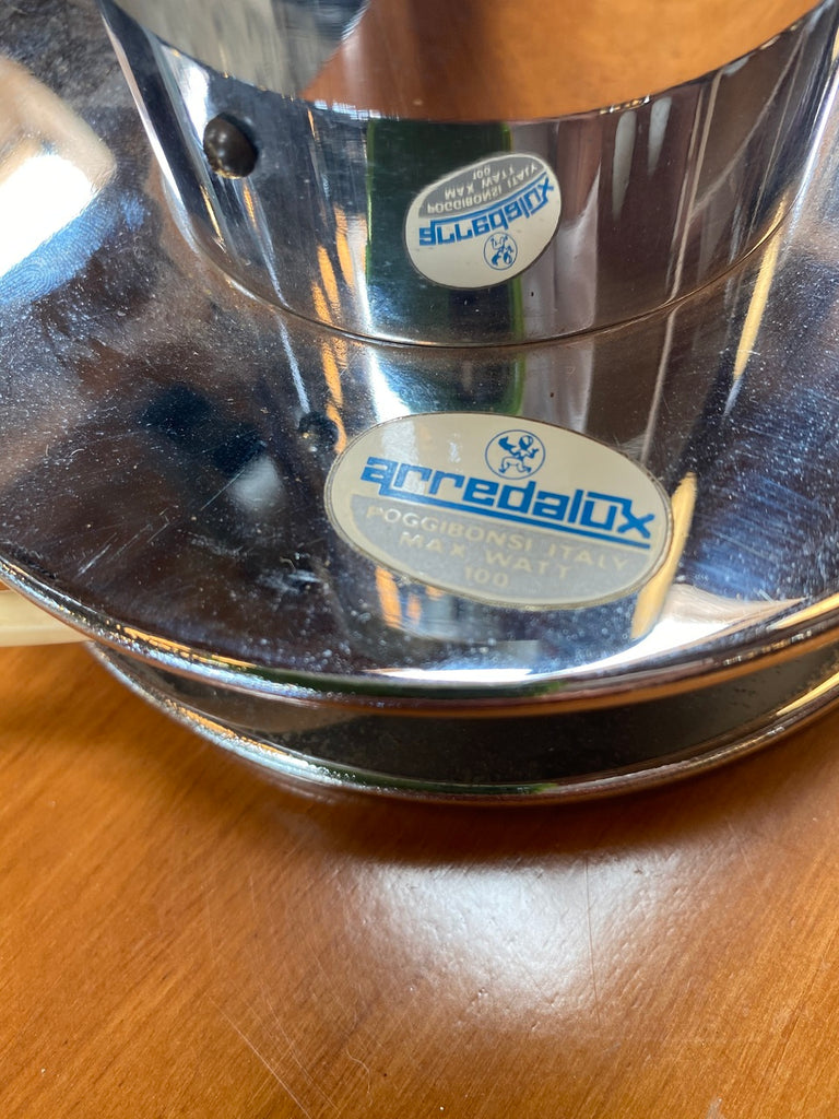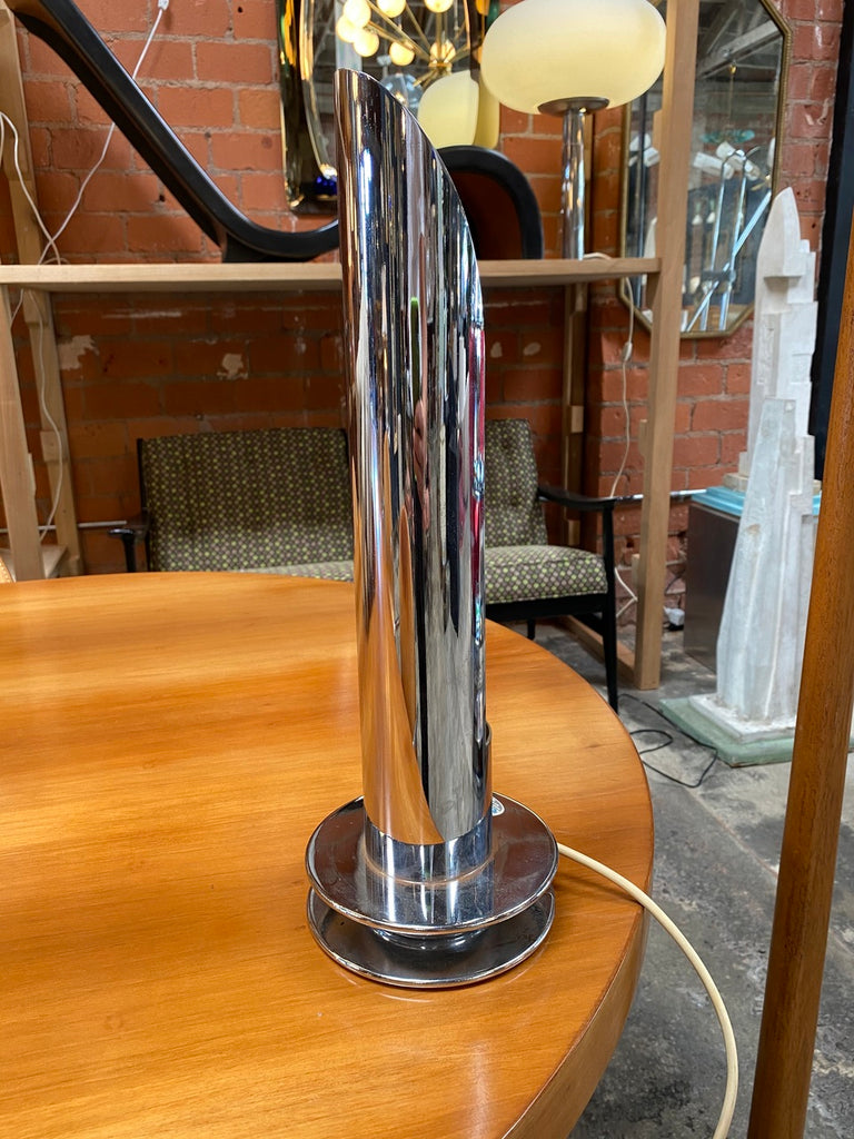 Amazing tubular table lamp by Arredoluce Italy 1970s created entirely in chrome with a very particular design, the lamp has a split in the center (as you can see in the photo) giving a greater amount of light. An iconic piece that will complete a midcentury style living room or studio with its timeless elegance.